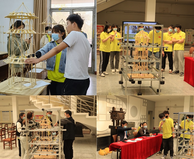 本次参赛模型以三重木塔结构为基本单元,主要包括设计作品理论方案介绍、模型加载测试、评委现场提问与选手答辩三个环节。参赛选手在第一环节对设计作品的模型制作及主要参数、结构受力分析、节点构造与施工等方面进行现场陈述;陈述过程中,模型加载测试也在紧锣密鼓进行,每项作品要求针对竖向荷载、扭转荷载及水平荷载三种荷载工况进行空间加载试验。每个经受住三轮加载测试的模型,都会获得现场参赛选手纷至沓来的掌声;模型加载过程中,评委老师对各项参赛作品都进行了详细点评,称赞参赛选手的坚毅力、创造力与团队协作能力,并针对作品结构设计的不足提出相应改进意见,这对于参赛选手提高理论与实践水平大有裨益。