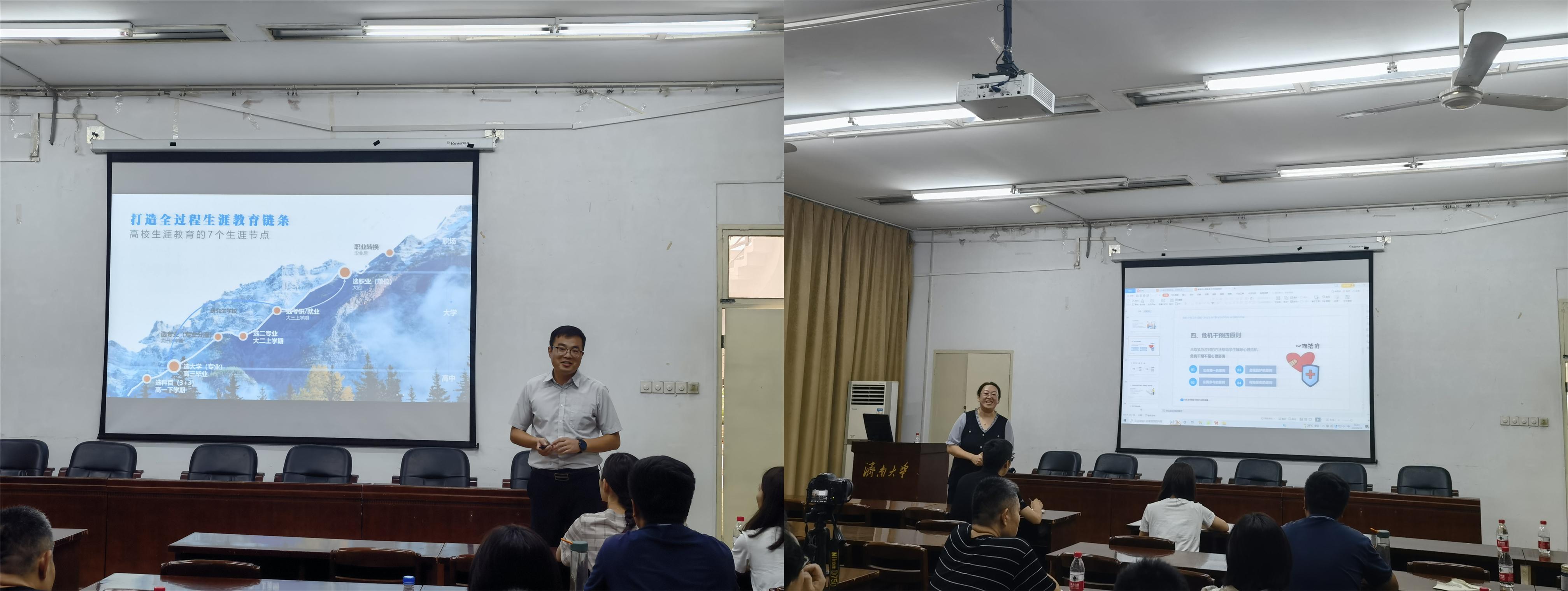 学生生涯发展指导中心主任张晶就如何做好大学生生涯规划指导做了专题报告。张晶指出大学生由高中步入大学,自身角色正经历由“单一”到“多元”的转变,需要给予大学生适时的生涯教育。张晶根据多年学生工作经验与总结,认为应打造全过程生涯教育链条,将大学生生涯划分为7个关键节点,并根据大学生学期特点,将高校生涯教育划分为5各阶段,根据各阶段不同的特点以及学生发展目标,分方向、分类别开展生涯教育指导。心理指导中心主任李素洁以心理教育工作技能培训为主题从实操层面给澳门娱乐城