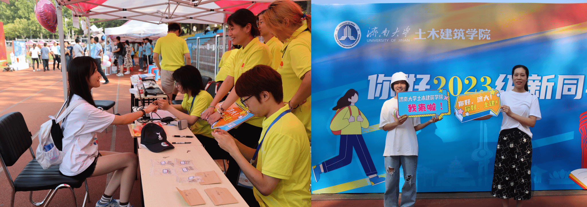 还设置了打卡留念地,让学生们留下在济大的第一张照片,志愿者热心地送上水和开学礼包,帮助入学新生完成报到手续并将行李送往所在宿舍。