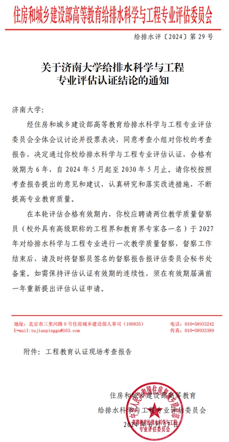 接到住房和城乡建设部高等教育给排水科学与工程专业评估委员会通知,给排水科学与工程专业顺利通过评估认证,有效期6年,成为澳门娱乐城