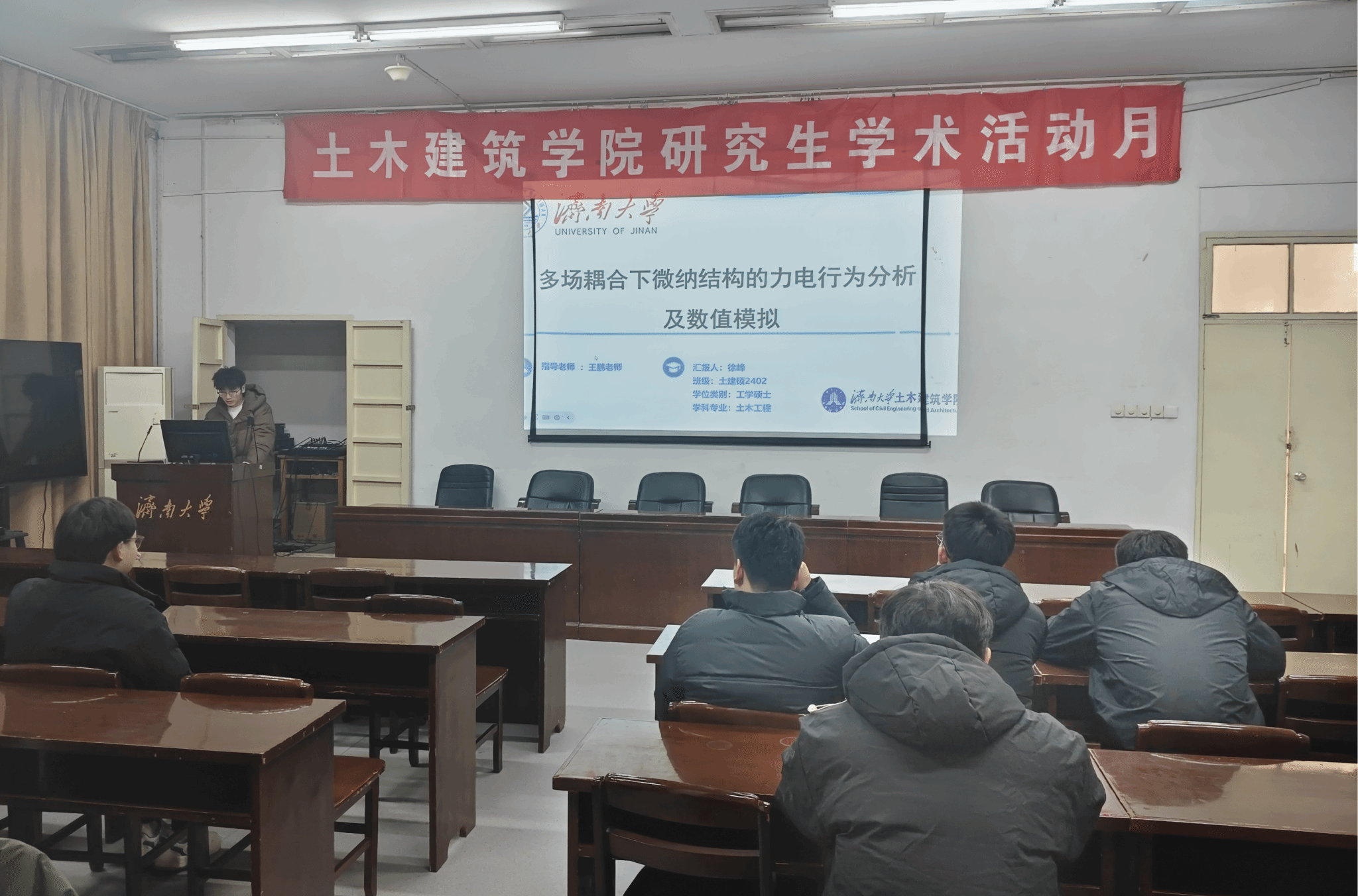 徐峰汇报多场耦合下微纳结构的力电行为分析与数值模拟,揭示微观尺度下结构力学与电学的协同效应。
