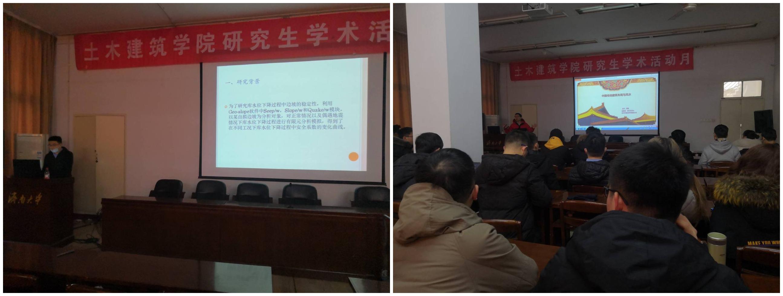 刘强教授就“中国传统建筑布局与风水”做了主题学术报告。刘老师在进行报告的同时,积极和同学互动,并结合历史上各种名人实例,讲述了中国传统文化对建筑布局设计的影响,让同学们深刻认识到了中西方思想、文化折射在建筑布局上的差异,带领同学领略了中国传统文化及建筑艺术之美,展开了一场思想、文化、建筑设计相互融合碰撞的巨大思想风暴。接下来,14位研究生对各自的学术论文做了相应报告,并与在座同学进行广泛交流,气氛活跃。
