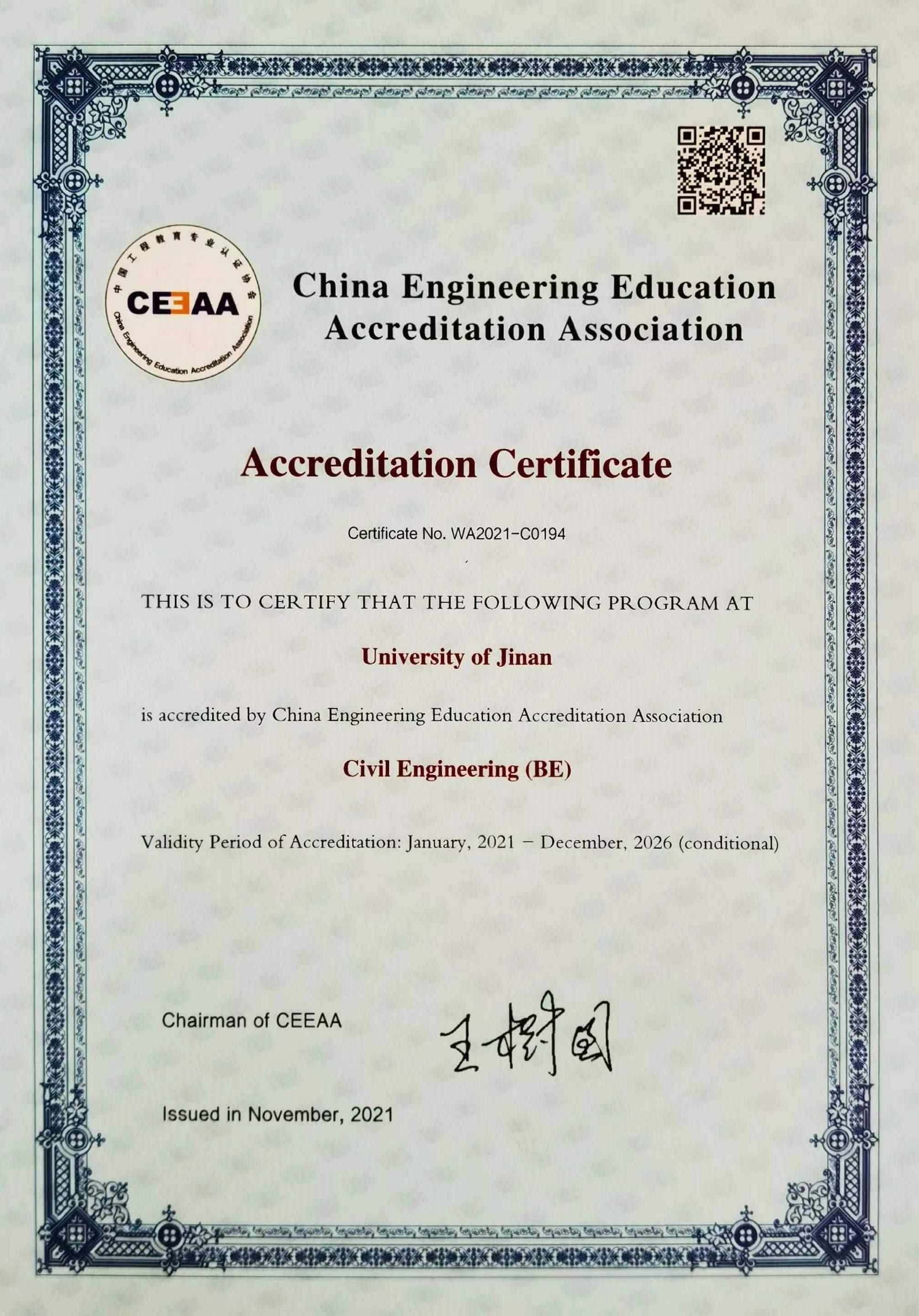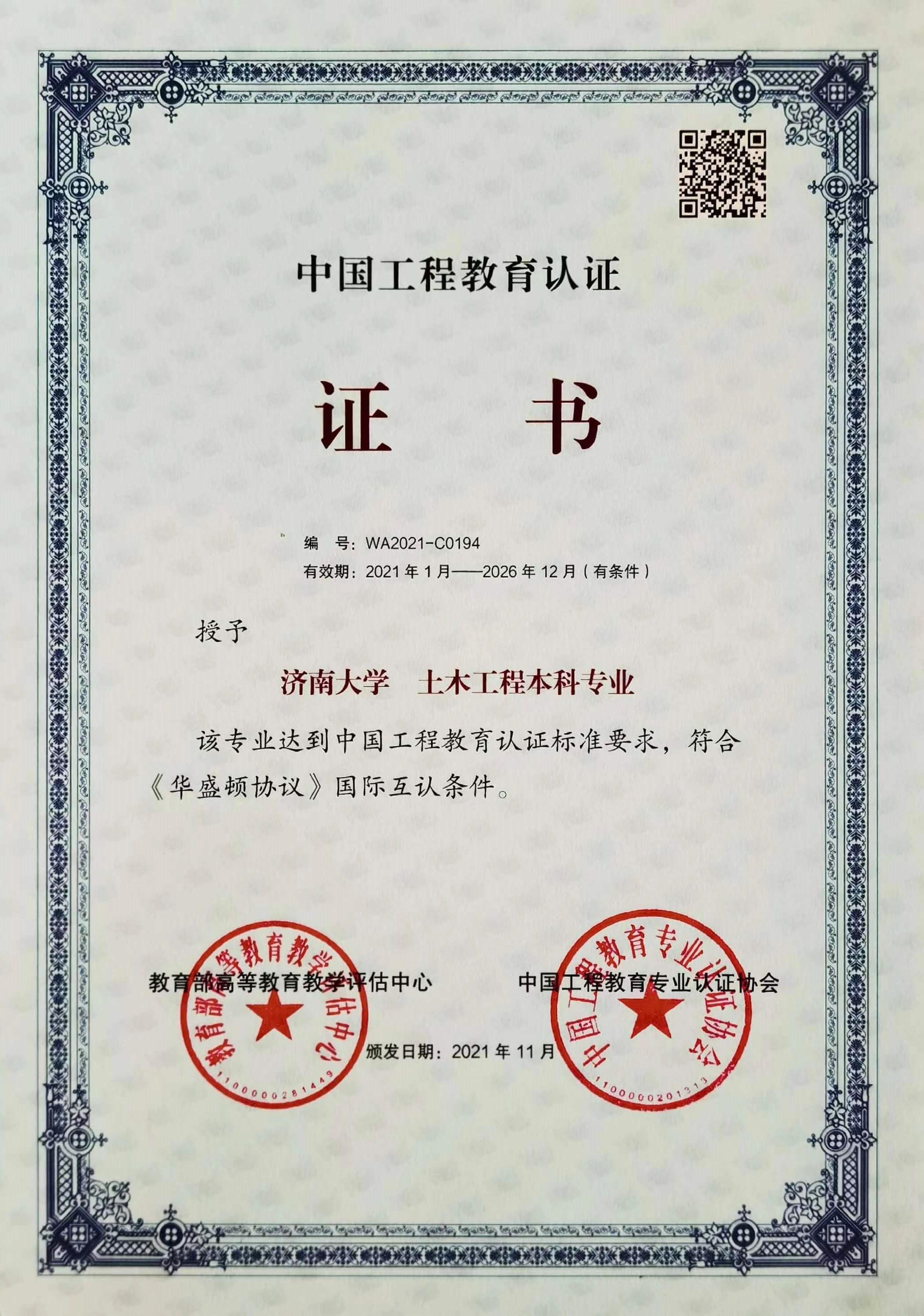 近日,教育部高等教育教学评估中心、中国工程教育专业认证协会为澳门娱乐城 土木工程专业颁发认证证书,认证时效6年(2021年1月-2026年12月)。