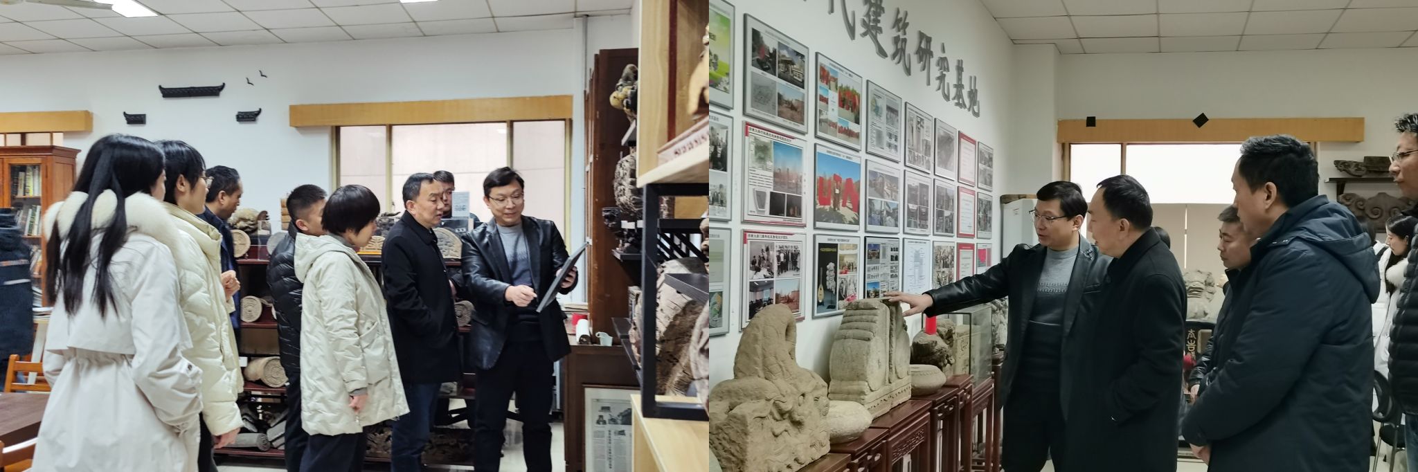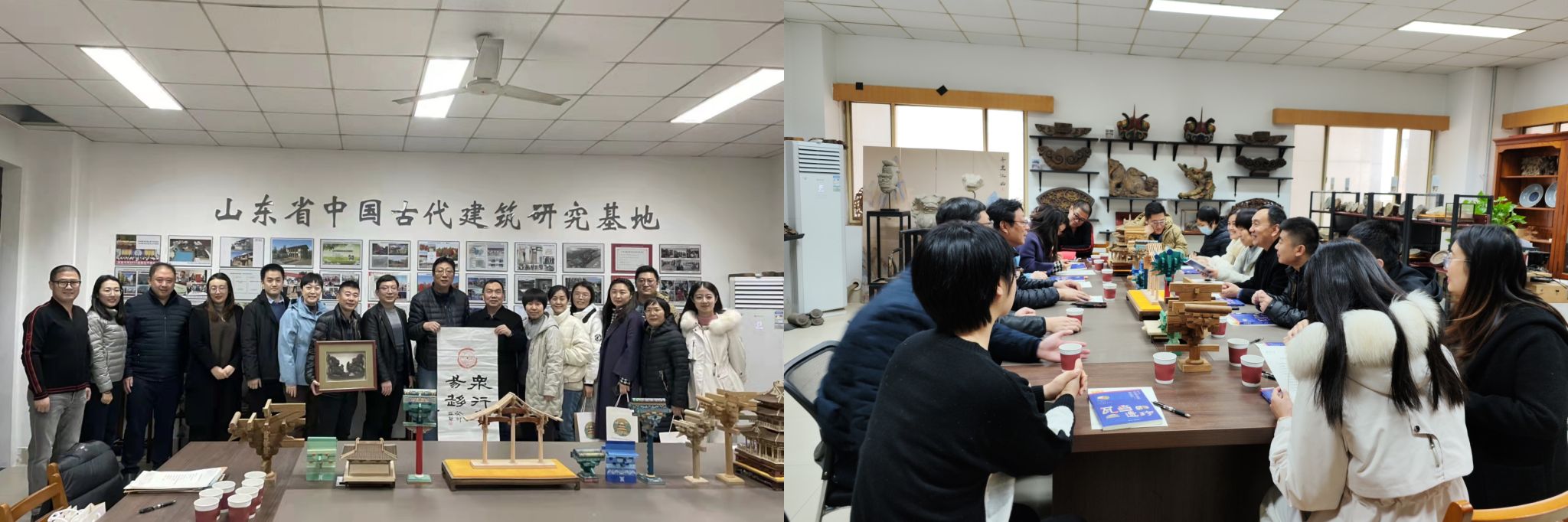 双方一起参观了位于校内十一教的山东省中国古代建筑研究基地,基地负责人刘强教授介绍了基地发展情况和团队取得的成果以及基地古建筑藏品的来历和文化内涵。