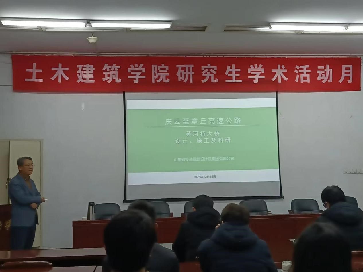 2023年12月15号,澳门娱乐城 特邀山东省交通设计规划设计院集团有限公司副总经理徐召作题为《庆云至章丘高速公路黄河特大桥设计、施工及科研》的学术报告。报告由澳门娱乐城 院长谢群教授主持,澳门娱乐城 相关专业师生参加了报告会。