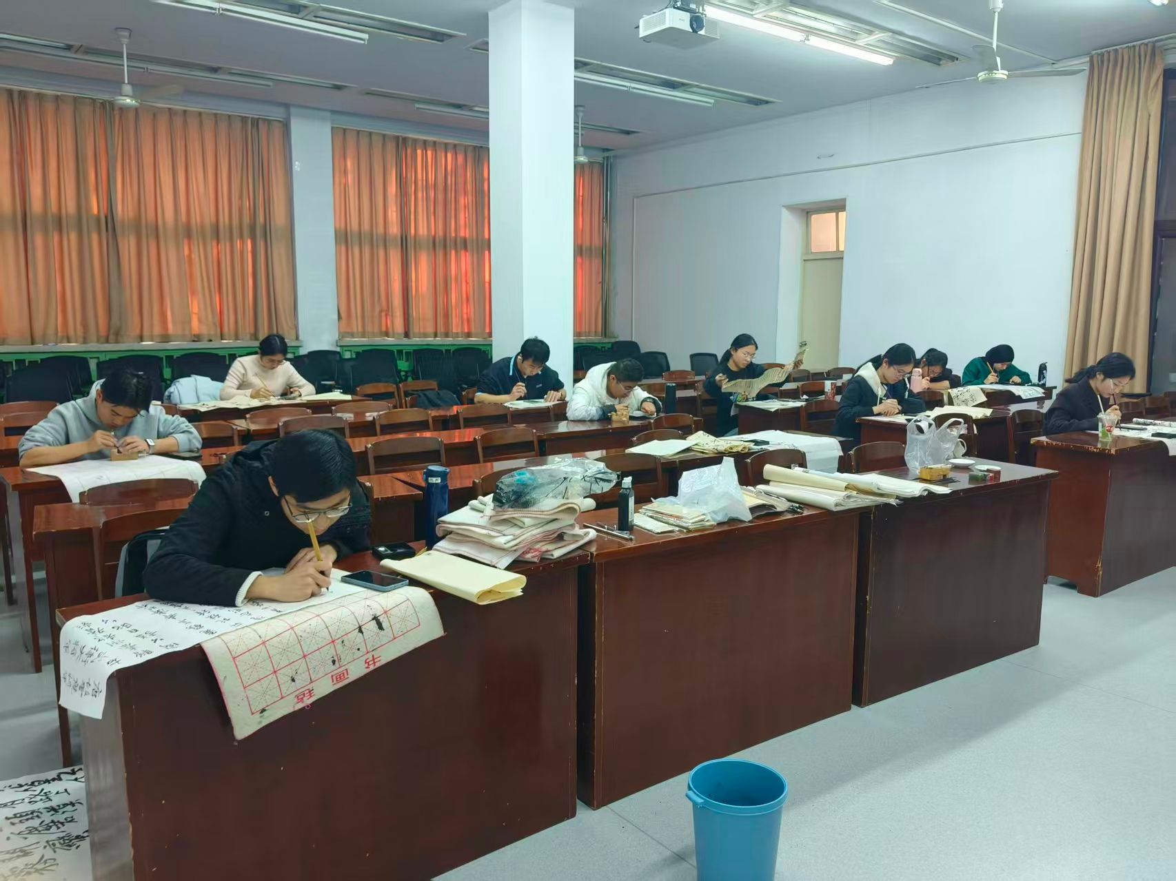 软笔书法练习区中,各专业学子凝神挥毫,反复临摹碑帖。字迹虽尚显青涩,眼神却满是专注与笃定。“练书法让我接触到专业课之外的天地,这份沉心静气的体验格外奇妙。”摩洛哥留学生维安有感而发。在同学们的热忱相助下,她逐笔揣摩汉字结构,逐步寻得这门东方艺术的深邃魅力。