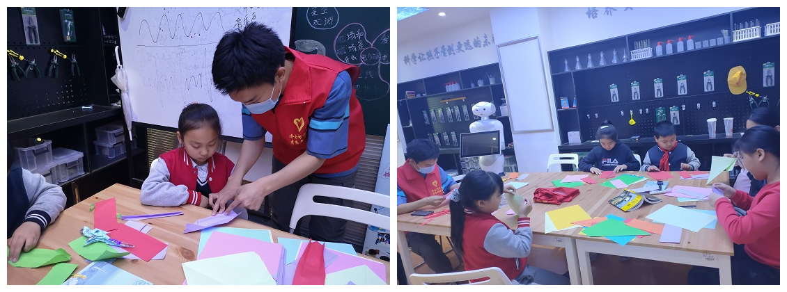 志愿者首先向小朋友们讲述了中国传统折纸的发展历史和折纸中所蕴含的中国人民对美好生活的向往,加深了小朋友们对折纸的深层次理解。紧接着志愿者向小朋友们讲述了折纸的各种技巧并亲自教授小朋友们折各种他们感兴趣的小动物和小物品,在寓教于乐中引发小朋友们对折纸的兴趣。折纸完成后,志愿者们对小朋友们的折纸成果进行集中展示、评比,在合理的竞争中使小朋友们更快更好地掌握折纸的基本技巧。