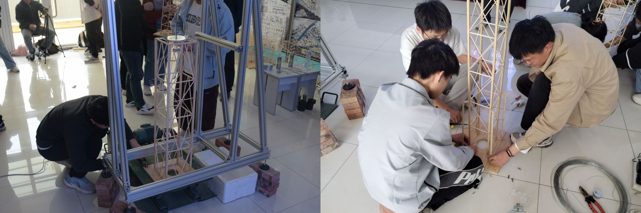 本次竞赛的主题为考虑水平振动的高耸塔式结构的设计与模型制作。参赛选手在第一环节对设计作品的模型制作及主要参数、结构受力分析、节点构造与施工等方面进行现场陈述并回答评委老师对己方方案的提问。随后,在模型加载测试阶段,各团队通过放置不同质量的砝码和施加不同的激励振动来实现不同工况下的结构受力。每当一项荷载测试顺利通过后,热烈的掌声层层迭起。评委老师对各项参赛作品进行了详细点评,针对作品结构设计的不足提出相应改进意见。