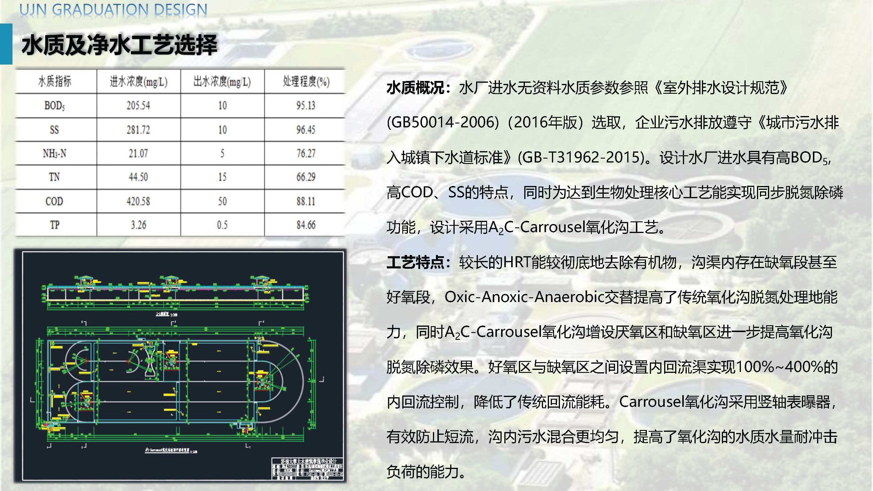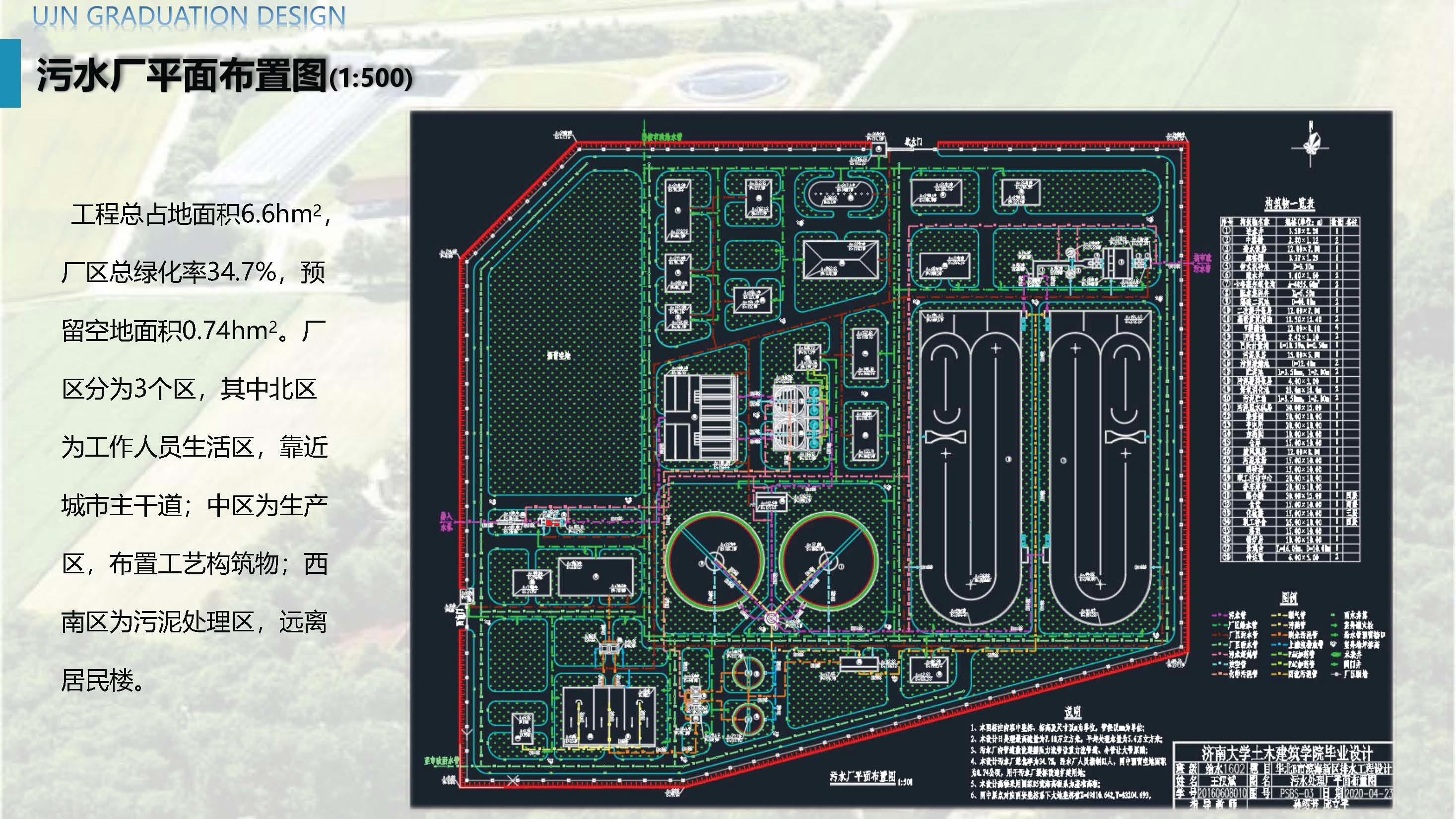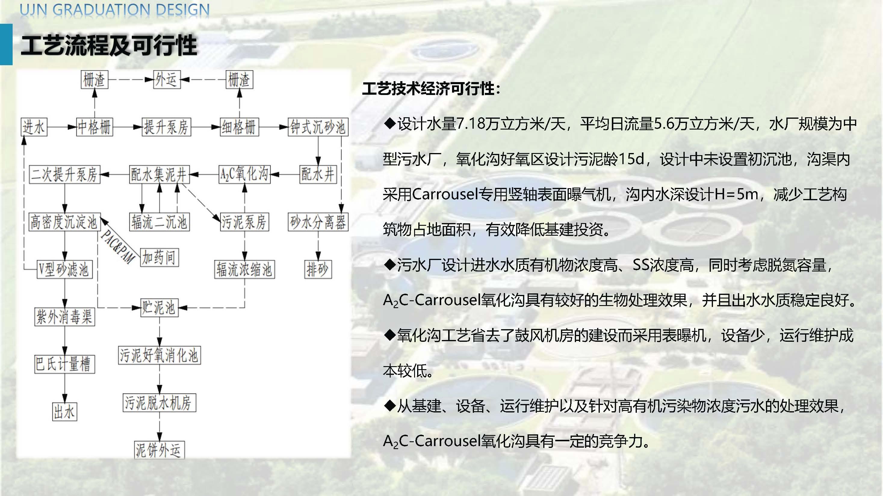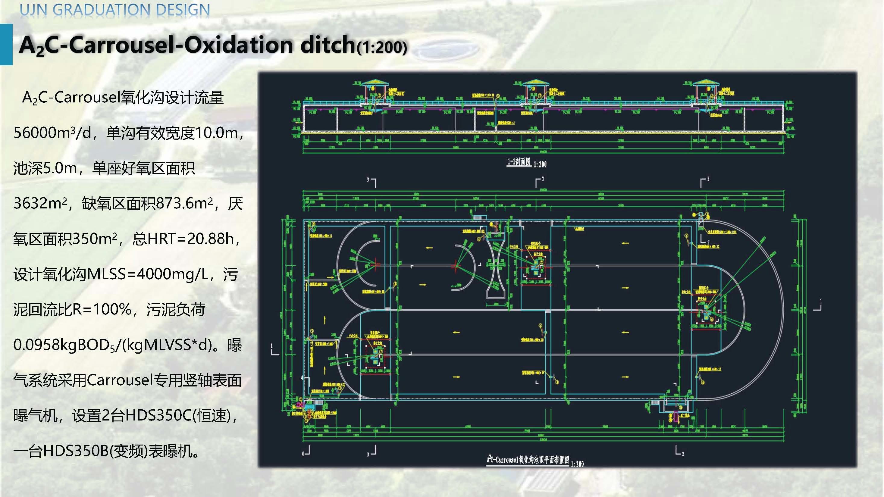 结论:管网设计中,城区距河流较远,直排式不利于雨水快速排除,且管段长,埋深较大,造价高,占用城市未规划用地较多,因此雨污水均采用截留式布置方式。污水厂设计水量7.18万立方米/天,属于中型污水厂,设计未设置初沉池,A2C-Carrousel氧化沟工艺设备少,运行维护简单,在经济中具有竞争力。氧化沟好氧区污泥龄设计15d,污泥有机质含量低,污泥规模较小,设计采用好氧消化能够进一步将剩余有机质、有毒有害物质降解,显著实现污泥的稳定、减量和无害化处理,中小型污水厂污泥采用好氧消化具备可行性,并且根据氧化沟内剩余污泥性质可适当降低好氧消化的规模及运行成本,因此设计好氧消化工艺具有一定的经济优势。
