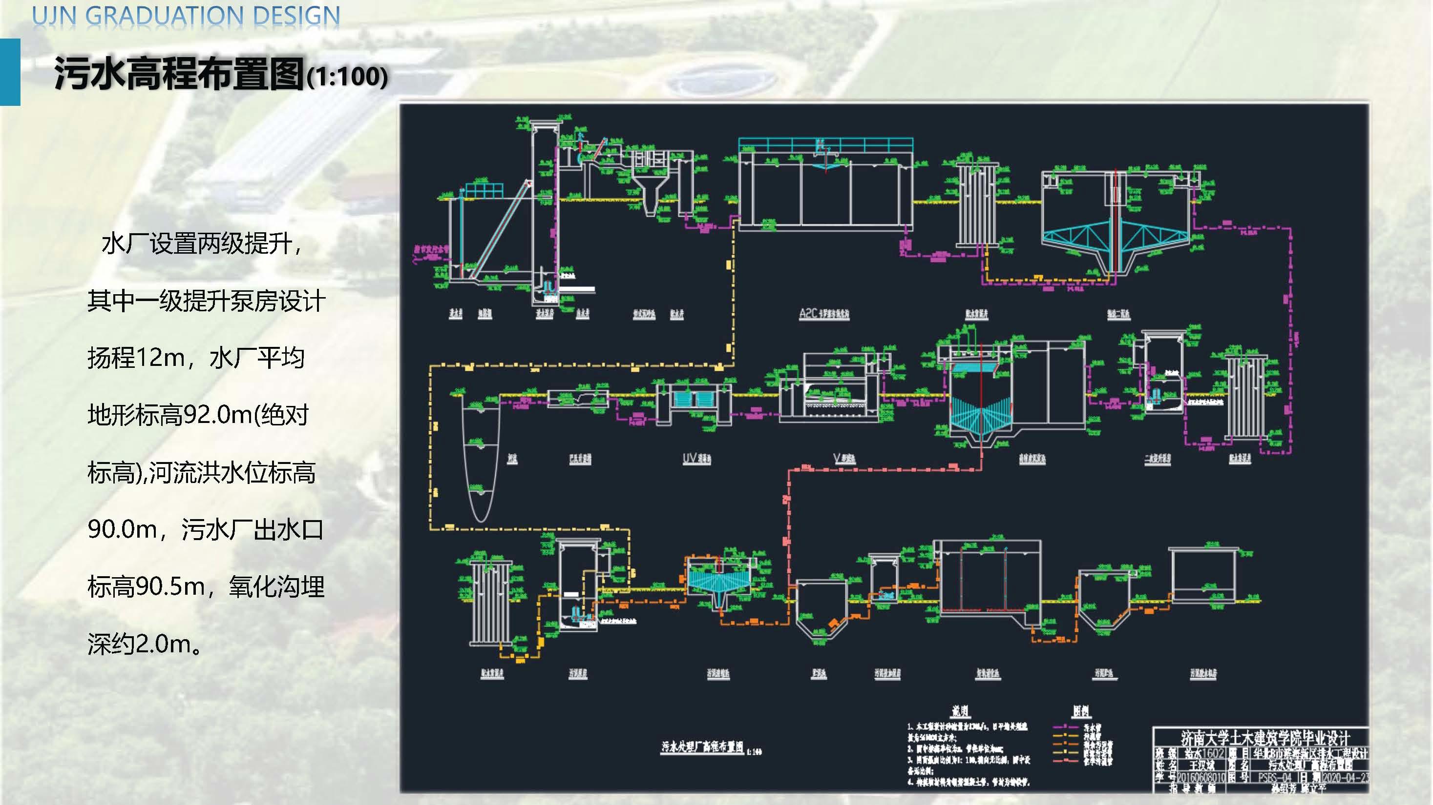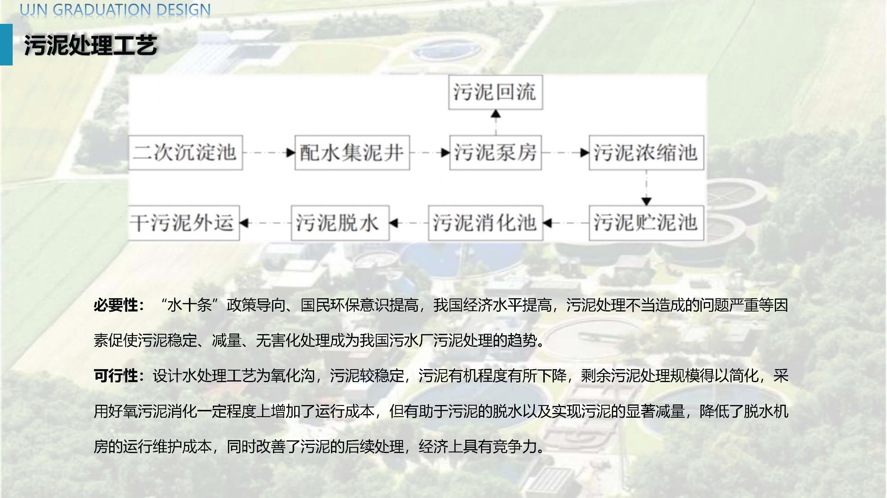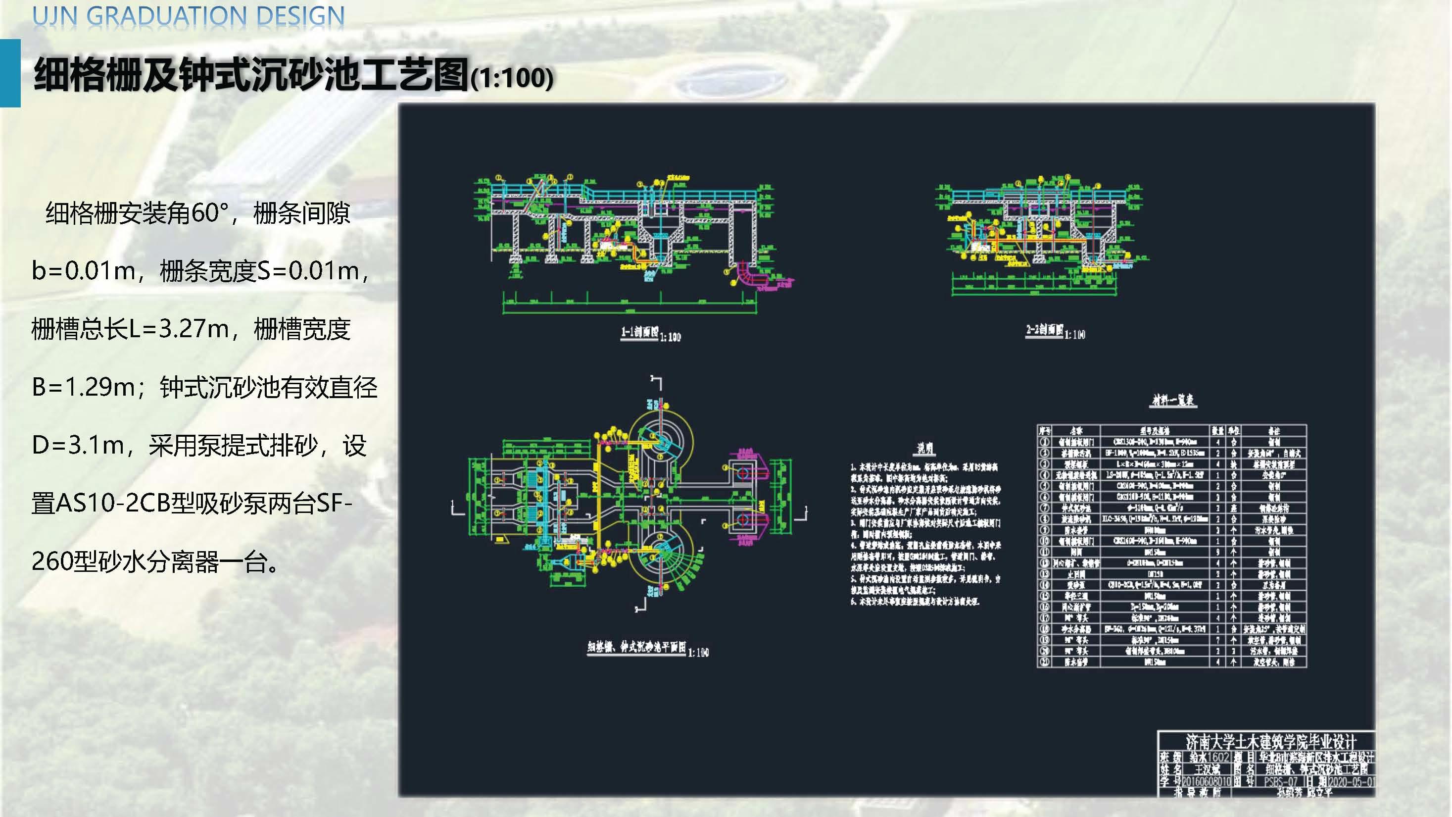 结论:管网设计中,城区距河流较远,直排式不利于雨水快速排除,且管段长,埋深较大,造价高,占用城市未规划用地较多,因此雨污水均采用截留式布置方式。污水厂设计水量7.18万立方米/天,属于中型污水厂,设计未设置初沉池,A2C-Carrousel氧化沟工艺设备少,运行维护简单,在经济中具有竞争力。氧化沟好氧区污泥龄设计15d,污泥有机质含量低,污泥规模较小,设计采用好氧消化能够进一步将剩余有机质、有毒有害物质降解,显著实现污泥的稳定、减量和无害化处理,中小型污水厂污泥采用好氧消化具备可行性,并且根据氧化沟内剩余污泥性质可适当降低好氧消化的规模及运行成本,因此设计好氧消化工艺具有一定的经济优势。