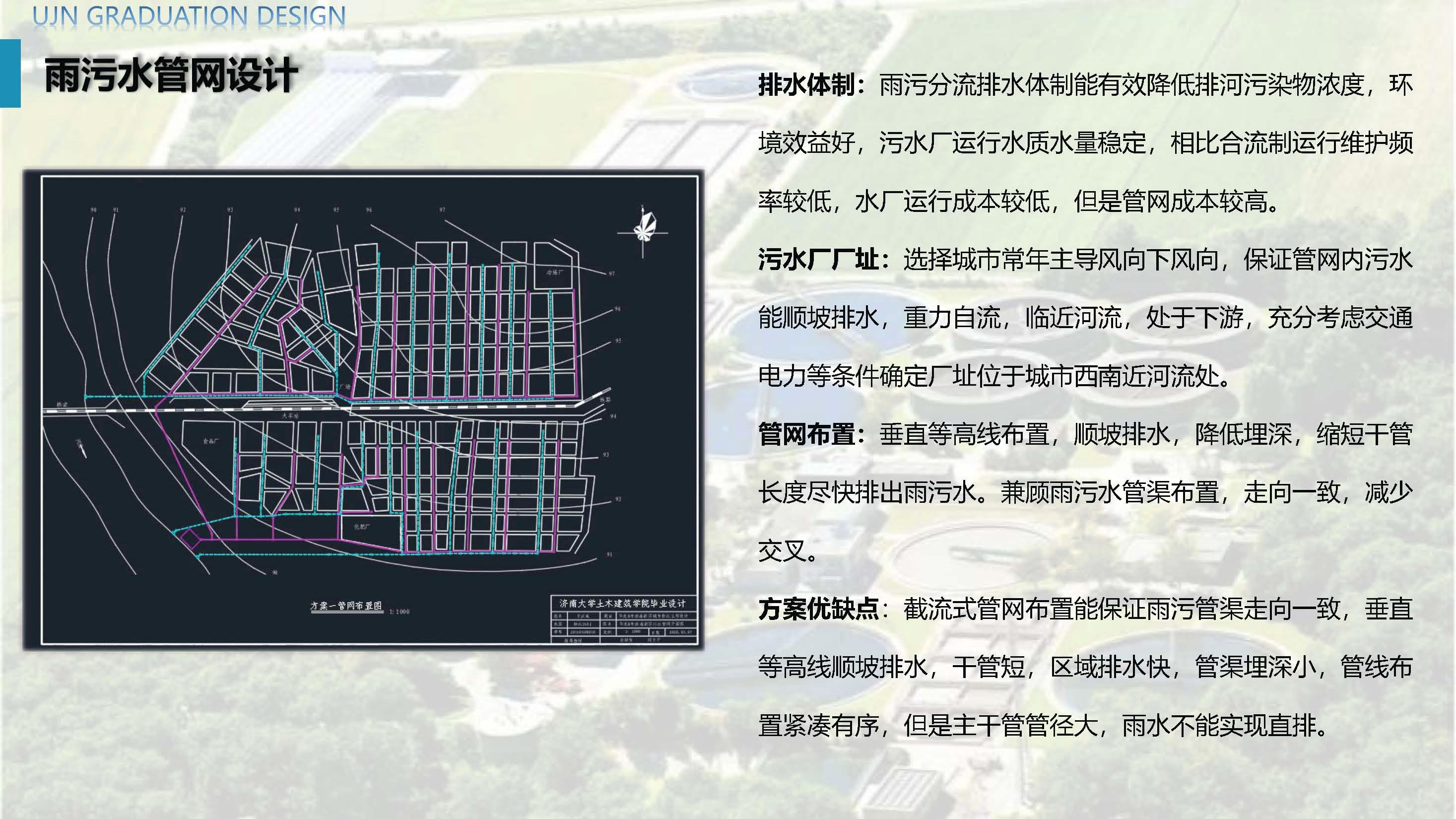 管网设计概述:设计采用雨污分流排水体制,污水厂位于城市西南侧,河流下游处。河流距城区较远,雨水管渠采用截留式,设计暴雨重现期3年,污水管渠与雨水管渠平行布置,采用截留式,垂直等高线敷设,减少埋深,污水管穿越铁路采用顶管施工。