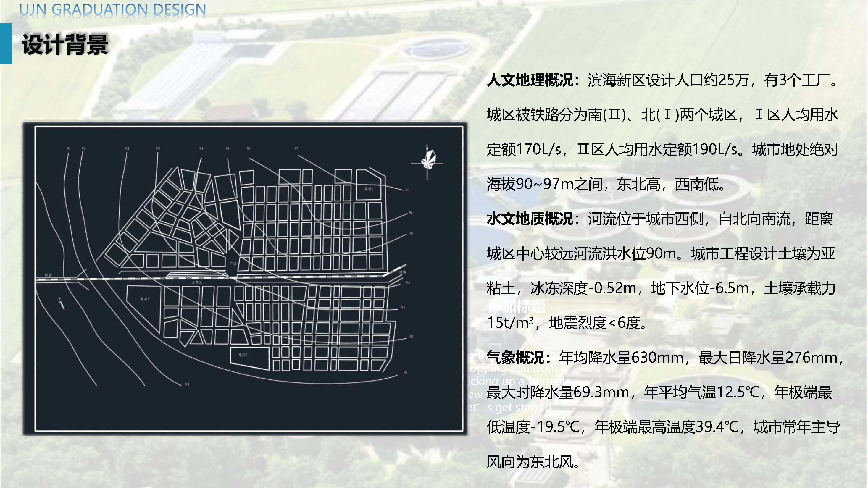 设计背景:设计地点地处华北滨海城市,地下水-6.5m,冰冻深度-0.52m;年平均降水量630mm,平均气温12.5℃。城市中部由铁路横穿分为Ⅰ、Ⅱ两个城区,地形东北高西南低,绝对标高位于90m~97m之间,河流位于城市西侧,城市常年主导风向为东北风;设计人口约25万,城市中有3个大型工厂,设计水量7.18万立方米/天,平均日流量5.6万立方米。