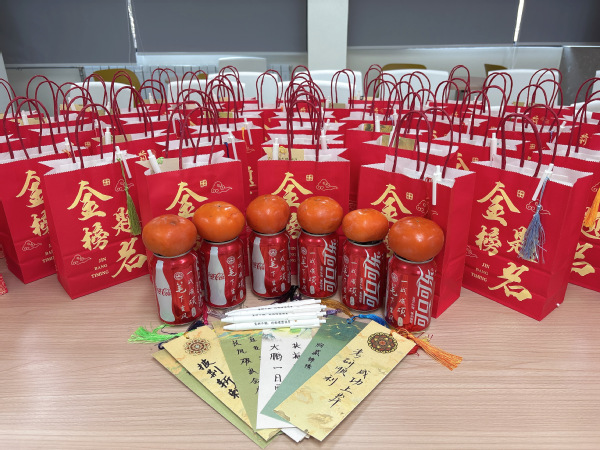 考研慰问暨动员活动在WH1103举行,澳门娱乐城 精心筹备考研大礼包,助力大家从容应考、决胜考场。礼包内的每一份礼物都暗藏深意,刻有“笔耕不辍,终抵理想彼岸”的签字笔,祝大家提笔从容自信、合笔如愿以偿;印有“笔下生风,一战成硕”的定制可乐,愿同学们疲惫时能补充元气、重拾干劲;一张张写满学弟学妹亲笔寄语的祝福书签,希望陪伴大家走过最后的复习时光,见证落笔生花的荣耀;一颗颗饱满鲜红的柿子,寄托了“柿柿”如意、考试顺遂的美好祝福。